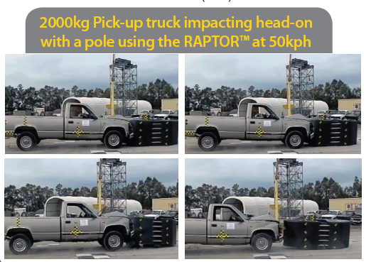 The Raptor Crash Cushion is an energy absorbing safety device designed to reduce the severity of vehicle impacts with utility poles or tree. The raptors barriers unique technology offers a compact low-cost solution in places where typical crash cushions would not physically fit and be able to provide sufficient protection.